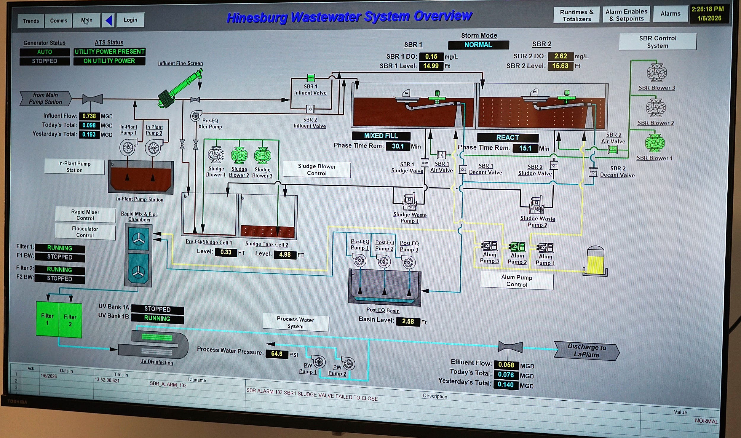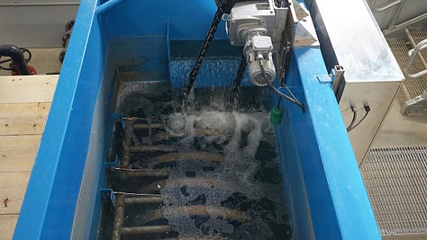 To begin, there are two open concrete tanks that collect ‘influent’, lagoons if you will, where the waste is treated with alum, aerated, mixed and then, when the solids have settled, the water at the top is piped (‘decanted’) into the plant for filtration and eventual decontamination via ultraviolet light before being discharged. No chlorine. Little phosphate or ammonia.