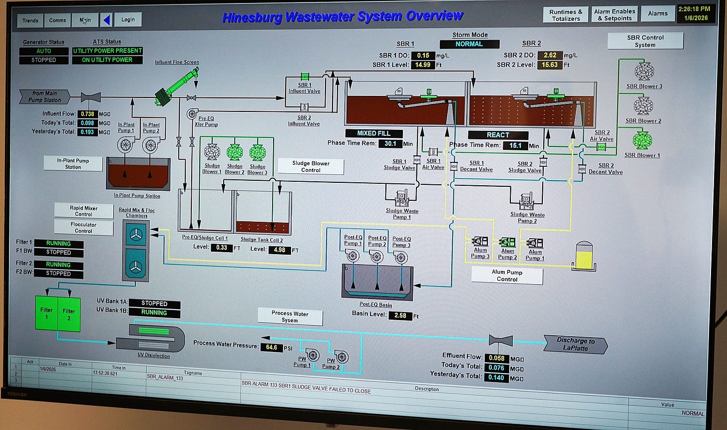 As you can see from the pictures, there’s not much to see. Much of the system is enclosed so there is little odor. Testing is done every day at various times and major tests are done at various stages of the operation – a requirement within the state’s discharge permit. All of this is computerized – except the testing of the water; if there is a problem, the computer lets the operators know.