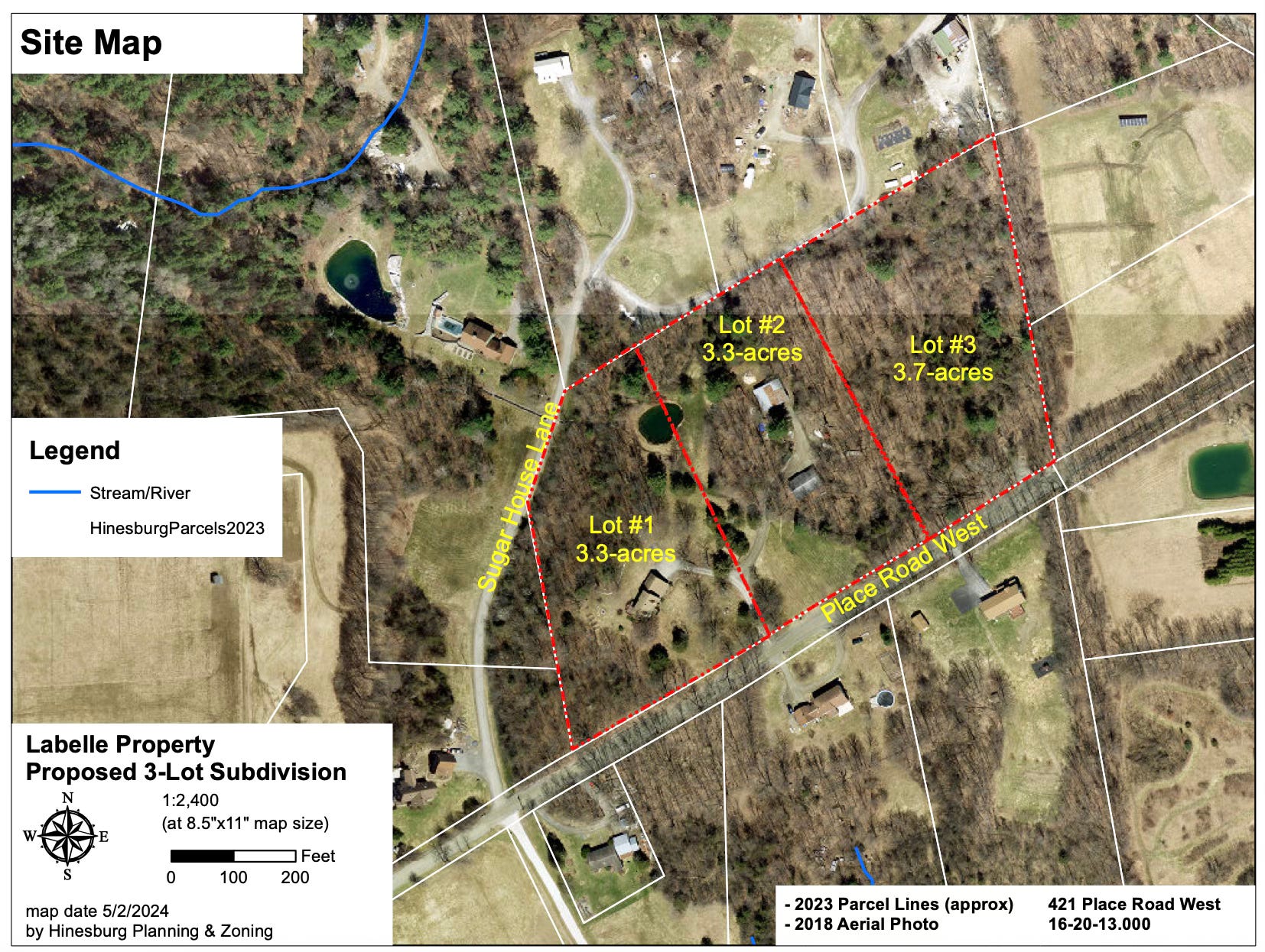 Ashley Labelle presented her sketch plan for a three-lot subdivision of a 10.20-acre property located at 421 Place Road West in the Rural Residential 1 Zoning District. She explained that she wanted to subdivide Lot 2 to herself and renovate one of the buildings into a rental property and sell the third lot with new access from Place Road.