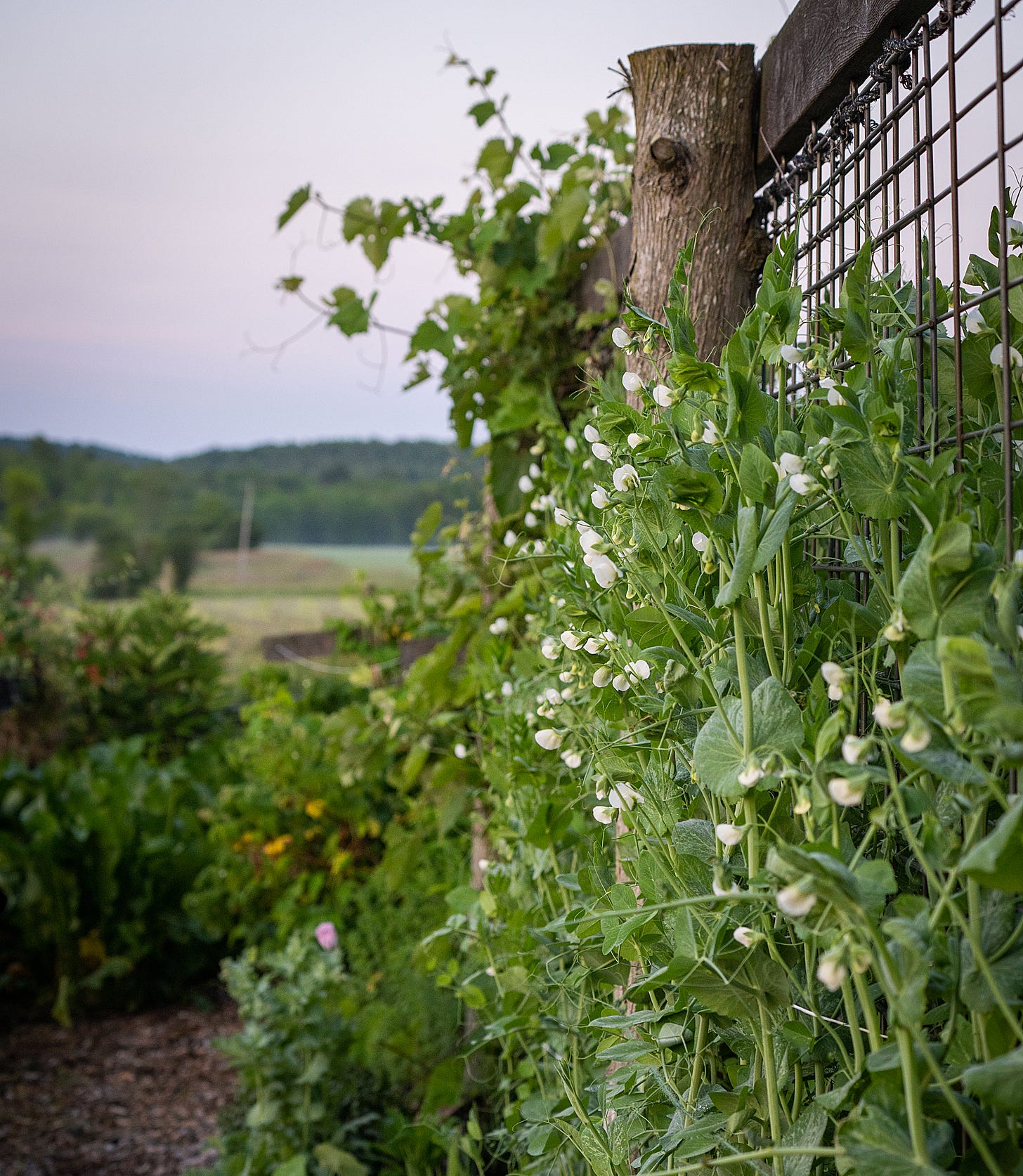 In our climate we recommend providing support for pea plants of all sizes. Four posts with a line of string surrounding a pea patch is sufficient to prevent shorter varieties from flopping over in the wind and rain. Anything taller than 4’ will benefit from a trellis. Chicken wire, cattle fence, hardware cloth or Hortonova netting attached to t-posts or wooden stakes are all great options.