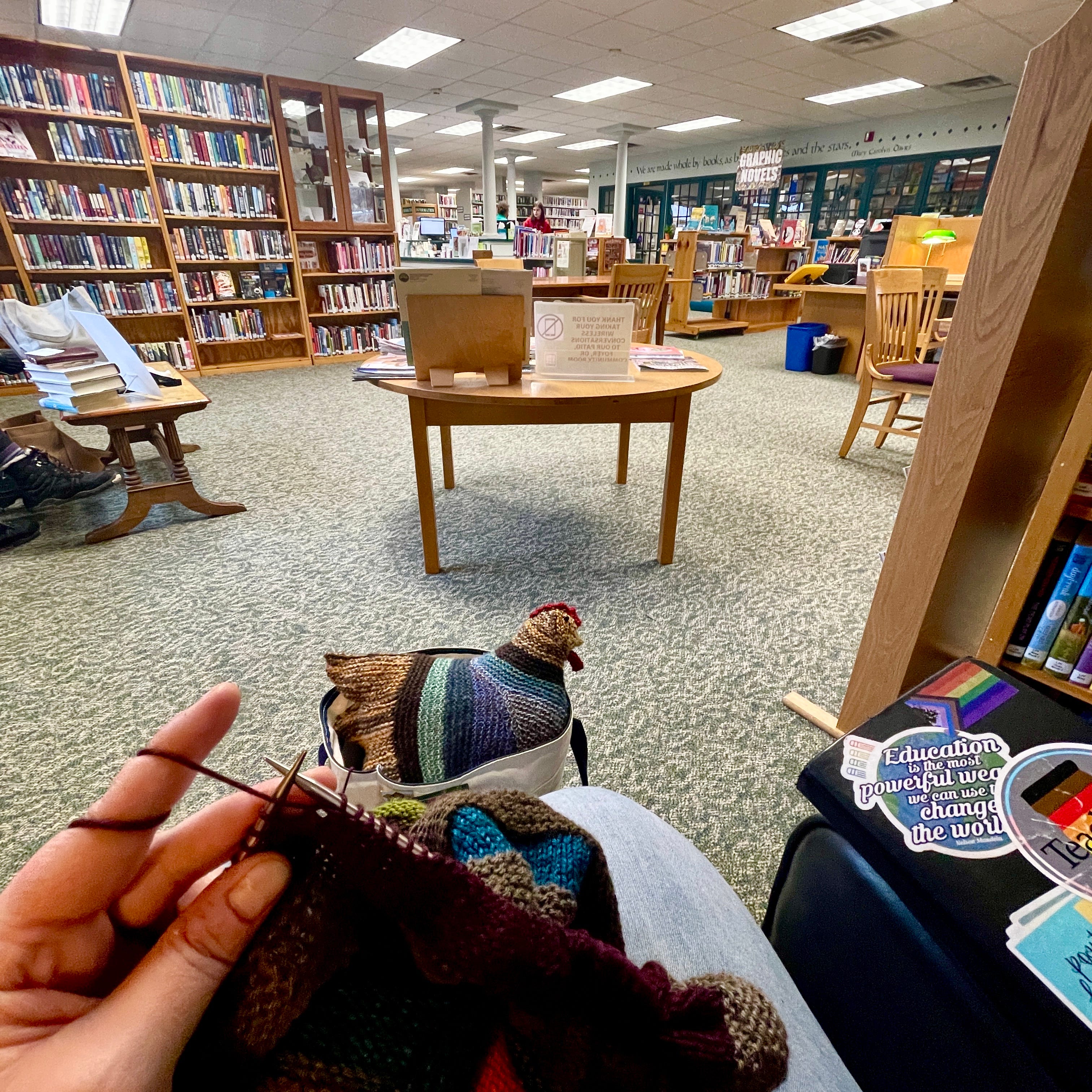 Dr. Hannah K. Miller, an Associate Professor of Education at Vermont State University Johnson, is on a quest to knit in every public (and academic) library in Vermont. Miller began this project when they took a sabbatical in January 2024. They write a short essay about each visit, which you can read on their website. Miller explains, “The posts are partially ethnographic (I write about what I learn about the library’s culture and community from one visit) and partially autobiographic (I write about what the library makes me feel and think about during the stop). My hand-knitted emotional support chicken, Hen Solo, accompanies me to each library.”