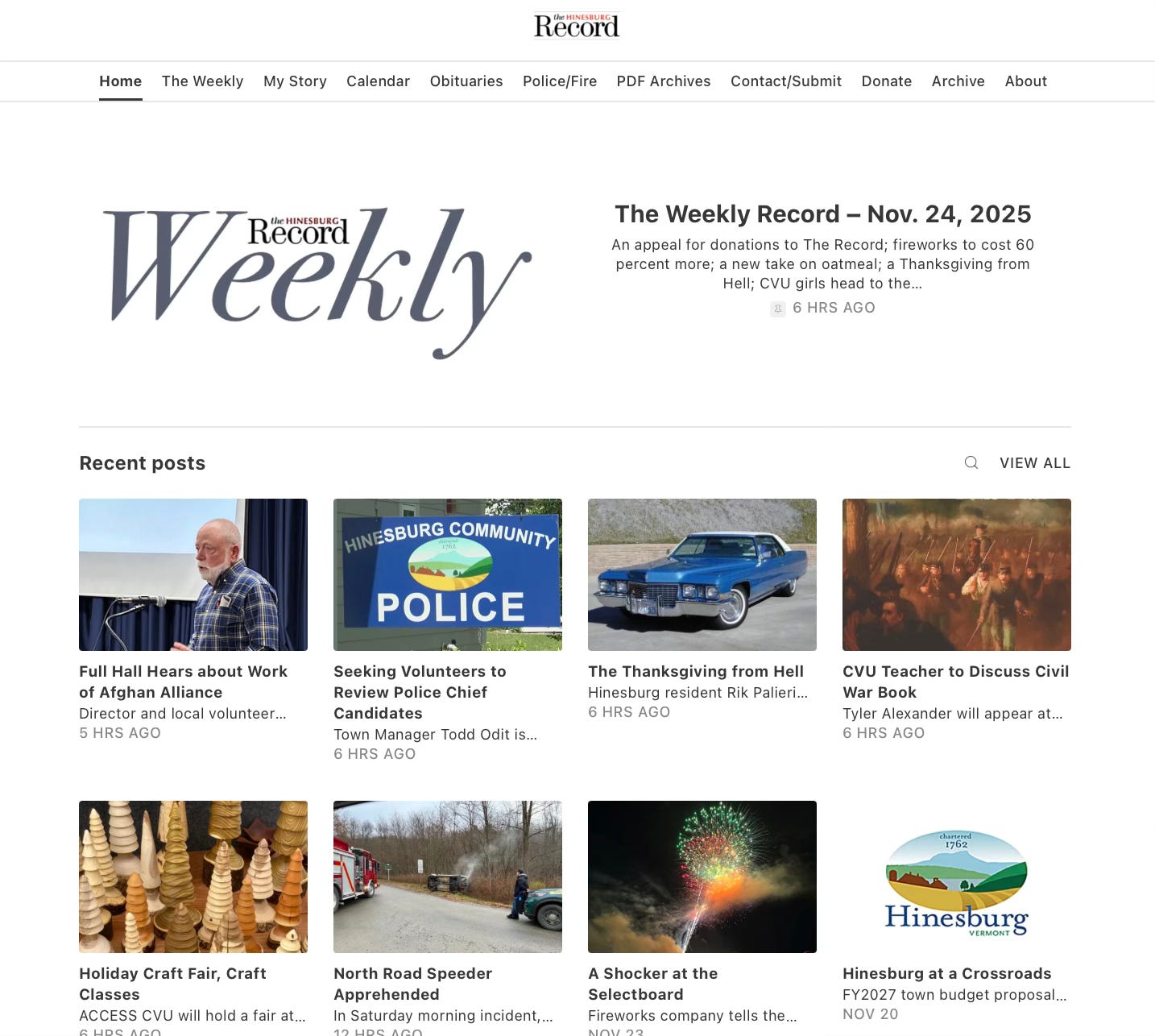 The Record will publish its final print edition on Dec. 10 and will then devote full efforts to the website, hinesburgrecord.org. For several months it has been sending out a weekly newsletter and has updated the site with new stories almost every day. Already its subscriber base has grown to 1,365, and over the last month has averaged over 800 visitors a day.
