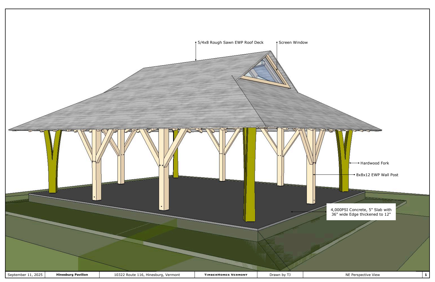 This spring, we hope the once vacant lot across from Parkside Café will be a busy place. The pavilion will be erected in one day by 20+ volunteers and supervision from a Vermont timber frame company that will craft it.