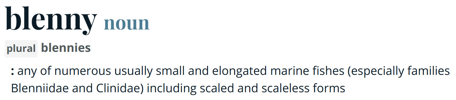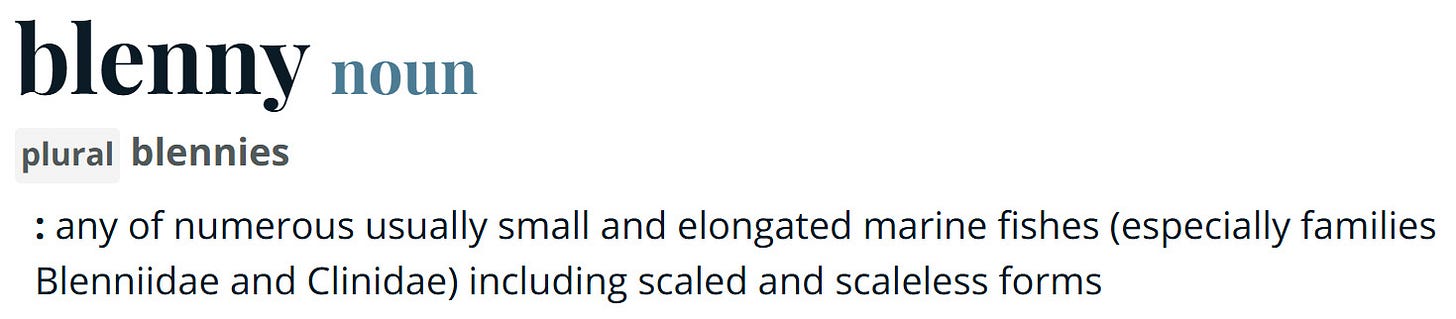 This week’s Word of the Week is “blenny.” I came across this while reading Remarkably Bright Creatures by Shelby Van Pelt. A blenny is a certain type of little fish. This novel has been on the New York Times bestseller list for over 64 weeks. In some cases like this, I wonder, “Is it really that good?” But I must say, I did really enjoy the book. Although there are certainly sad parts, I think that overall, it’s a feel-good story. It’s coming out in movie form next month, but I recommend you read the book first (or instead) if you have the time.