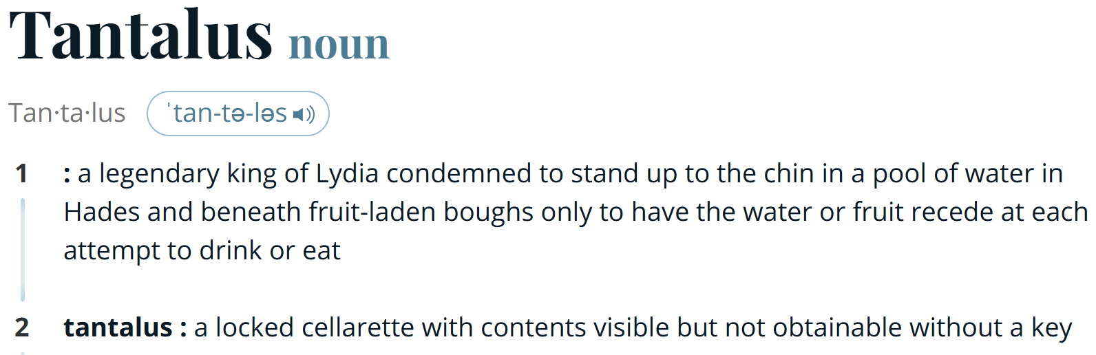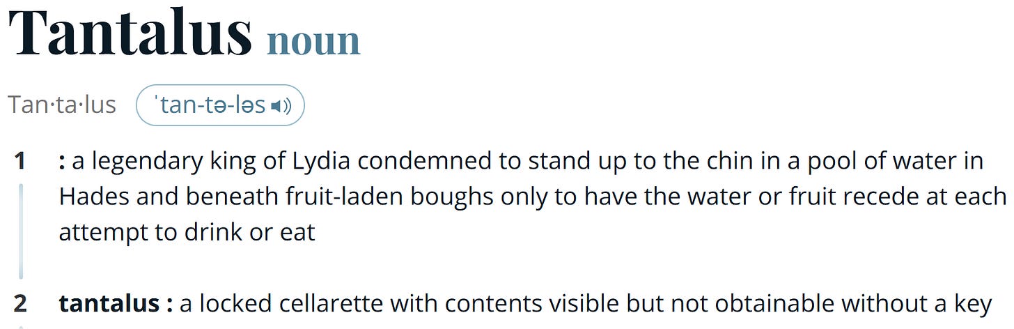 The word that I chose for this week’s Word of the Week truly lead me down the rabbit hole of research. This week’s word is “tantalus”. It sounds like a creature might be encountered on Star Trek.