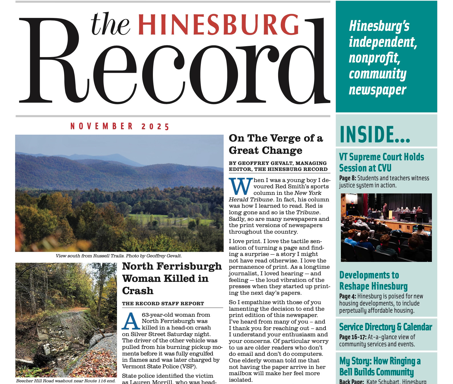The November issue of The Hinesburg Record will publish on Thursday. It is our penultimate issue. The last printed issue will be published Dec. 11. Then we will be all-digital, all-the-time. Look for the paper in your mailbox. And don’t forget to subscribe to our site by clicking the button below (or send an email to editor@hinesburgrecord.org or call 802-482-5625 and we’ll sign you up) so you don’t miss a single issue of Monday’s The Weekly Record. And don’t forget to explore the site during the week; we update it as news comes in.
