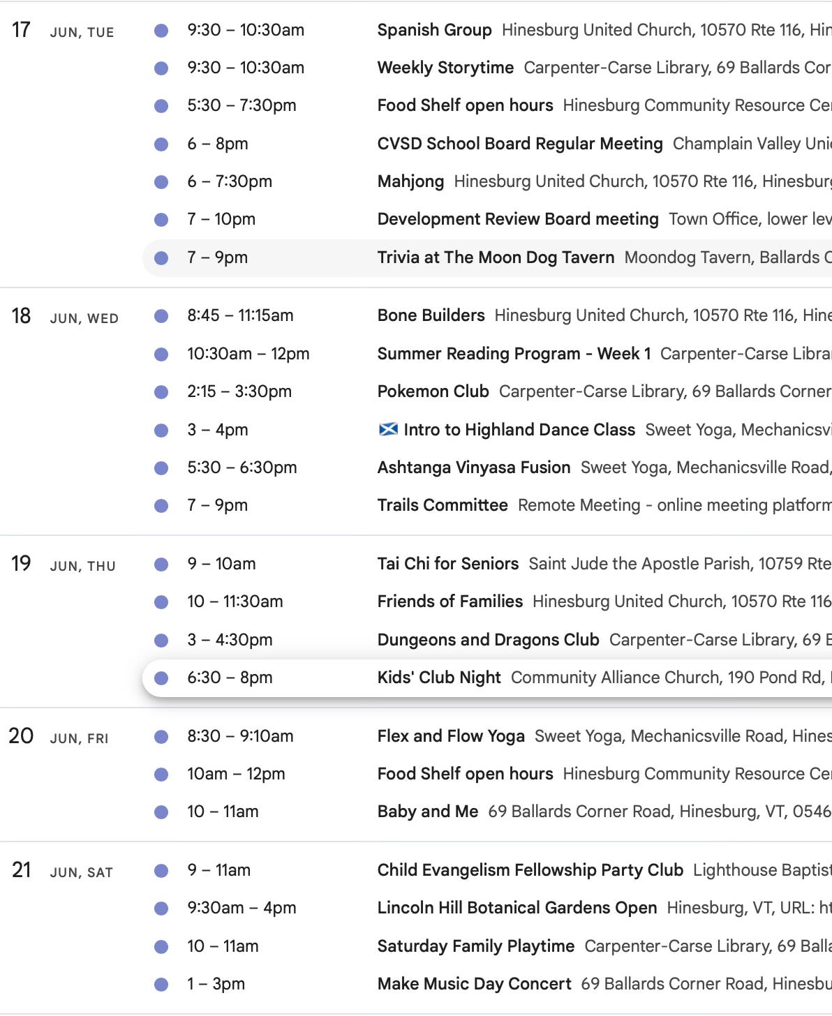 The Hinesburg Selectboard meets on Wednesday June 18 at 6 p.m. at Town Hall or on Zoom (click link here at time of meeting). A busy agenda, that includes discussion of a lease/purchase agreement for a new water transmission line from the well drilled at Haystack Crossing, can be found here.