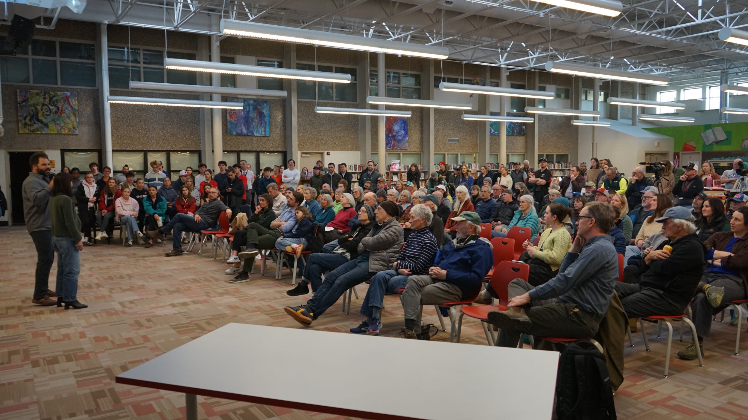 Several hundred people – students, parents, citizens of Hinesburg and of other communities – crowded into the CVU library Wednesday night to hear the formal proposal for a privately financed $5.5 million artificial turf field at CVU.